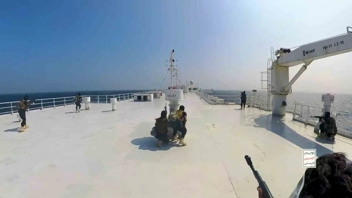 Husiler, dün Kızıldeniz’de 22 mürettebatı ile birlikte el koydukları kargo gemisine ait görüntüleri yayınladı.