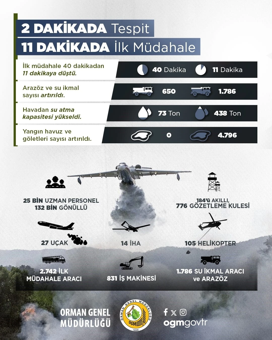 "Tüm dünyada gece yangın söndürme uçuşları, genellikle helikopterlerle çok sınırlı ölçüde yapılmaktadır. Çünkü etkisi sınırlı, riski ise oldukça yüksektir. Ülkemizde de bu uçuşlar, gündüz belirlenen güvenli rotalar üzerinde deneme ve geliştirme kapsamında gerçekleştirilmektedir. Her yıl ihtiyaçlar doğrultusunda personel ve ekipman sayımız artırılmakta, teknolojik gelişmeler titizlikle takip edilerek mücadele kapasitemize entegre edilmektedir. Teşkilatımız, yangınlara karşı her yıl düzenli olarak hazırlık ve önleyici çalışmalar yürütmektedir. Ölü ve diri örtü temizliği yapılmakta, yangın riskini azaltacak şekilde orman bakımı gerçekleştirilmektedir. ’BenimOrmanım’ kampanyası ile ormana atılan atıklar ve çöpler toplanarak farkındalık oluşturulmaktadır. Orman köylerinde eğitimler verilmekte, okullarda tiyatro gösterileri ile çocuklarda orman bilinci geliştirilmektedir. Yangın önleme şeritleri, orman yolları ve yangına dirençli orman projeleri hayata geçirilmektedir. Yangın söndürme havuz ve göleti sayıları arttırılmaktadır. Yangına dirençli türlerle ağaçlandırma çalışmaları yapılmaktadır. Orman yangınları konusunda taraflı ve yanıltıcı dezenformasyona itibar etmeyin. Vatandaşlarımızı bu alanda doğru bilgi edinmeye ve orman yangını gönüllüsü eğitimlerine katılarak mücadelemize destek vermeye davet ediyoruz. Yüzde 90’dan fazlası insan kaynaklı nedenlerle başlayan yangınları birlikte önleyebileceğimizi hatırlatıyoruz."