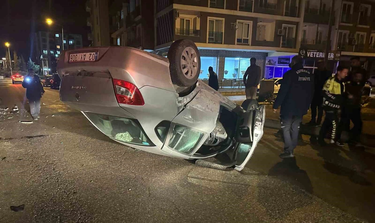 Adıyaman’da iki otomobilin çarpışması sonucu araçlardan biri ters döndü.