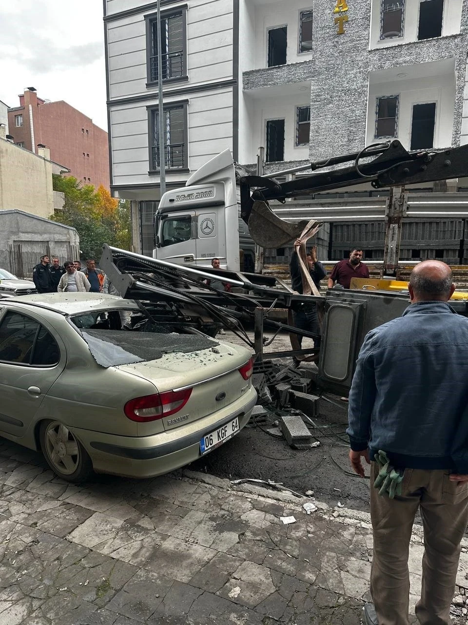 Devrilen Forklift ve tuğla paleti nedeniyle otomobilde büyük çapta hasar meydana geldi. Devrilen Forklift daha sonra kepçe yardımıyla aracın üzerinden kaldırıldı.