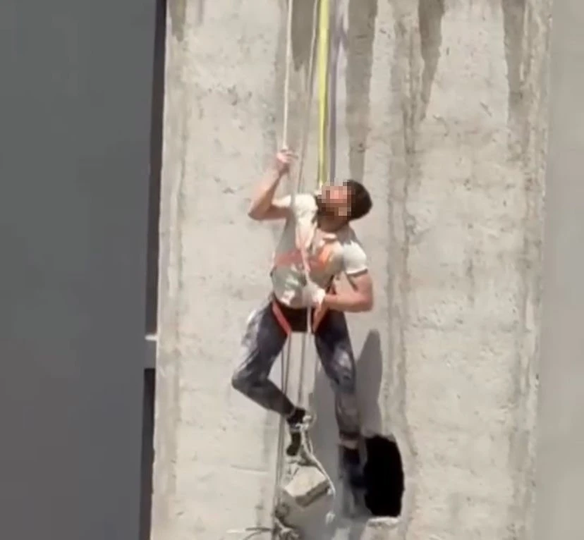 Olay, merkez Mezitli ilçesi Tece Mahallesi’ndeki inşaat halindeki 10 katlı bir binada meydana geldi. Edinilen bilgiye göre, iskelede 6. katta çalışan bir işçi, halatın aniden kopmasıyla birlikte metrelerce yükseklikte havada asılı kaldı. Emniyet halatı bağlı olan işçi, 5. kat seviyesinde dakikalarca yardım bekledi. Bir süre sonra emniyet halatının ani bir gevşemesiyle işçi hızla aşağıya doğru kaydı ancak 1. kat seviyesinde tekrar durdurdu. Büyük panik yaşayan olayda işçi yara almadan kurtarıldı.