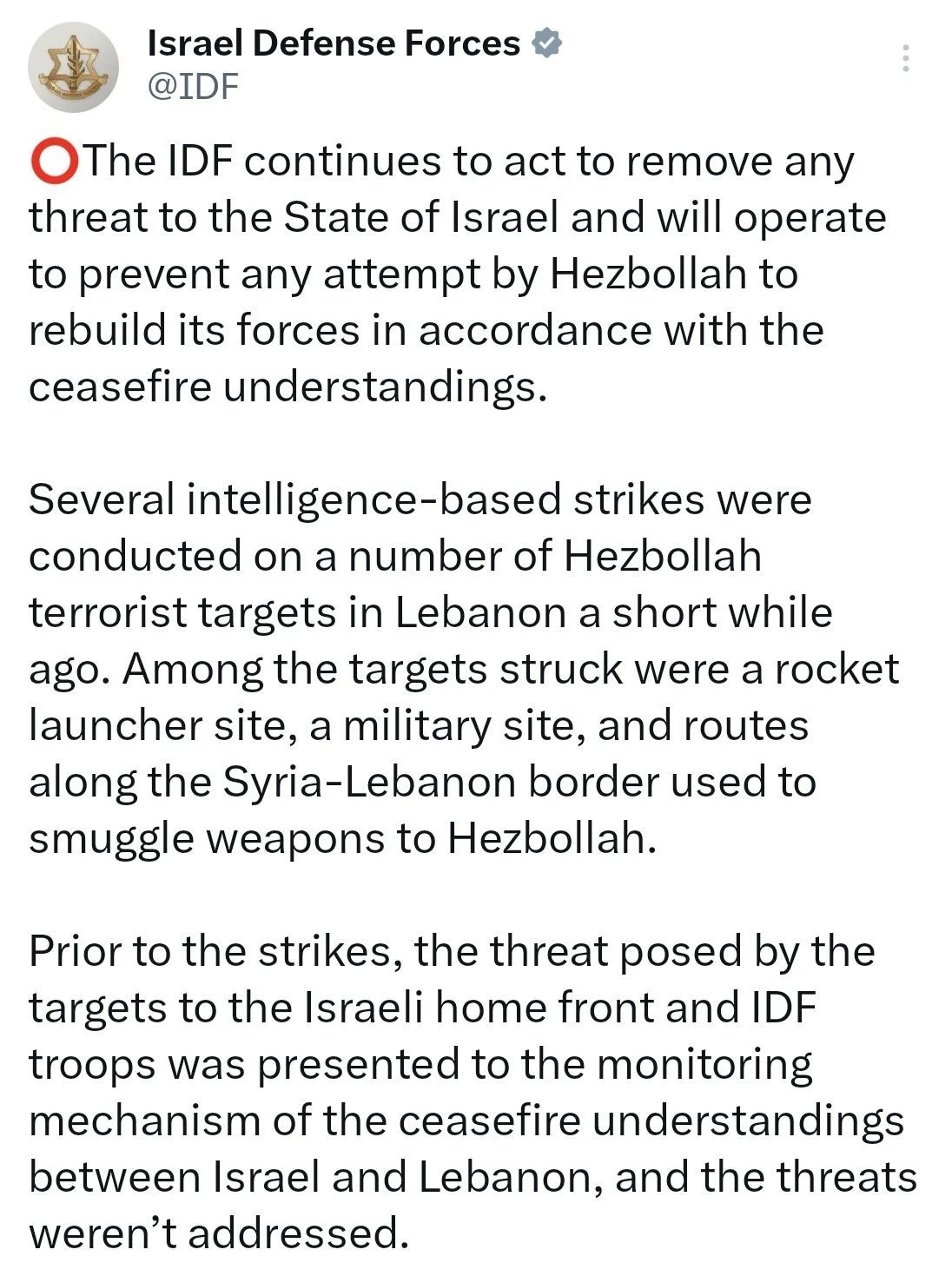 İsrail Savunma Kuvvetleri (IDF), Hizbullah’ın Lübnan’da yeniden güçlenmesini engellemek amacıyla Lübnan’daki Hizbullah hedeflerine yönelik istihbarat temelli bir dizi saldırı gerçekleştirildiğini açıkladı.
