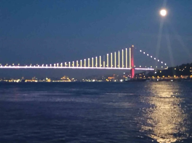 İstanbul Boğazı’nda dolunay, 15 Temmuz Şehitler Köprüsü ile birlikte görsel şölen oluşturdu.