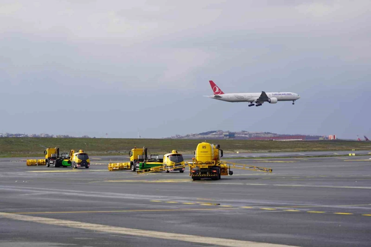 İstanbul’u etkisi altına alan yoğun kar yağışı ve soğuk hava nedeniyle İstanbul Havalimanı’nda uçuşların olumsuz etkilenmemesi için ekipler apronda çalışma yapıyor. Havalimanı’nda 404 personel 179 araç karla mücadele ediyor.