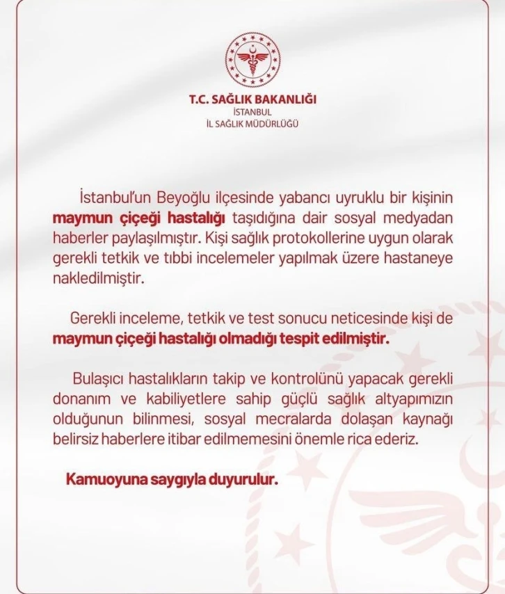 İstanbul İl Sağlık Müdürlüğü’nden yapılan açıklamada, "İstanbul’un Beyoğlu ilçesinde yabancı uyruklu bir kişinin maymun çiçeği hastalığı taşıdığına dair sosyal medyadan haberler paylaşılmıştır. Kişi sağlık protokollerine uygun olarak gerekli tetkik ve tıbbi incelemeler yapılmak üzere hastaneye nakledilmiştir. Gerekli inceleme, tetkik ve test sonucu neticesinde kişide maymun çiçeği hastalığı olmadığı tespit edilmiştir. Bulaşıcı hastalıkların takip ve kontrolünü yapacak gerekli donanım ve kabiliyetlere sahip güçlü sağlık altyapımızın olduğunun bilinmesini, sosyal mecralarda dolaşan kaynağı belirsiz haberlere itibar edilmemesini önemle rica ederiz" denildi.