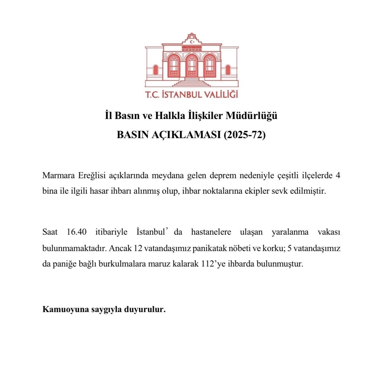 Marmara’da saat 14.55’te 5 büyüklüğünde deprem meydana gelirken İstanbul’un birçok noktasında vatandaşlar kendilerini dışarı attı. İstanbul Valiliği yaptığı açıklamada, "Marmara Ereğlisi açıklarında meydana gelen deprem nedeniyle çeşitli ilçelerde 4 bina ile ilgili hasar ihbarı alınmış olup, ihbar noktalarına ekipler sevk edilmiştir. Saat 16.40 itibariyle İstanbul’da hastanelere ulaşan yaralanma vakası bulunmamaktadır. Ancak 12 vatandaşımız panikatak nöbeti ve korku; 5 vatandaşımız da paniğe bağlı burkulmalara maruz kalarak 112’ye ihbarda bulunmuştur" ifadelerini kullandı.