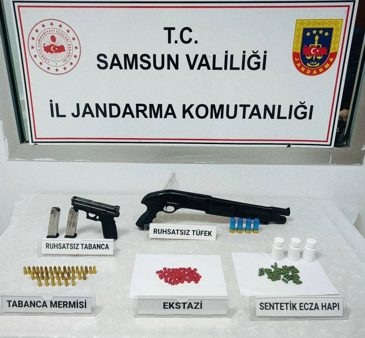 Edinilen bilgiye göre, Samsun’un Çarşamba ilçesinde jandarma ekipleri tarafından kaçakçılık ve uyuşturucu madde ticaretinin önlenmesine yönelik yapılan araştırma sonucu İ.Z.(55) ve G.T.(57) isimli şahısların uyuşturucu madde bulundurdukları bilgisine ulaşıldı. Çarşamba İlçe Jandarma Komutanlığı ekiplerince şahıslara ait işyerinde yapılan aramada, 33 adet sentetik ecza hap, 59 adet ecstasy, 1 adet ruhsatsız tabanca, 1 adet ruhsatsız av tüfeği ve 34 adet tabanca fişeği ele geçirildi.