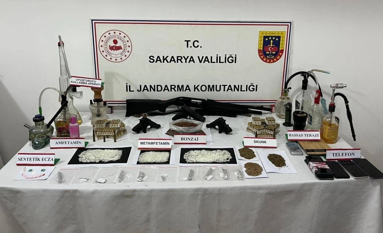 Sakarya İl Jandarma Komutanlığı sorumluluk bölgesinde suçun önlenmesine yönelik çalışmalarına devam ediyor. Bu çerçevede Erenler ilçesinde uyuşturucu ve silah kaçakçılığına yönelik yapılan eş zamanlı operasyonda M.Ç.(43), E.G.(26), K.A.(34) ve Ç.Ü.(33) isimli şüpheliler gözaltına alındı. Ev ve eklentilerde yapılan aramada; 220 gram metamfetamin, 200 gram sentetik uyuşturucu, 30 gram skunk, 40 gram satışa hazır halde metamfetamin, 8 adet uyuşturucu kullanma aparatı, 2 adeta hassas terazi, 3 adet ruhsatsız tabanca, 1 adet yarı otomatik av tüfeği, 6 adet cep telefonu ele geçirildi. Haklarında adli işlem başlatılan K.A.(34) serbest, Ç.Ü.(33) ise adli kontrol şartıyla serbest bırakılırken M.Ç.(43) ve E.G. (26) tutuklandı.