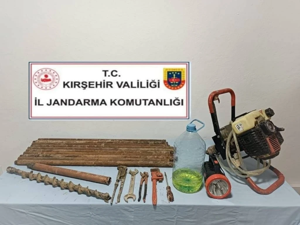 Kırşehir’in Mucur ilçesinde izinsiz kazı yaptığı belirlenen 2 şüpheli, jandarma ekipleri tarafından foto kapanla tespit edilerek suçüstü yakalandı. Edinilen bilgiye göre, İl Jandarma Komutanlığı Kaçakçılık ve Organize Suçlarla Mücadele Şube Müdürlüğü ile Mucur İlçe Jandarma Komutanlığı ekipleri, kaçak kazılara yönelik yürütülen çalışmalar kapsamında Dağ Çiftliği bölgesine foto kapan yerleştirdi. Yapılan takip sonucunda Y.A. ve F.D. isimli şahısların bölgede kaçak kazı yaptığı belirlendi. Operasyon düzenleyen ekipler, 2 şüpheliyi suçüstü yakalayarak gözaltına aldı. Olay yerinde yapılan incelemelerde, 1 adet el sondajı ve burgu makinesi, 12 delici sondaj makine burgusu ile çeşitli kazı malzemelerine el konuldu.