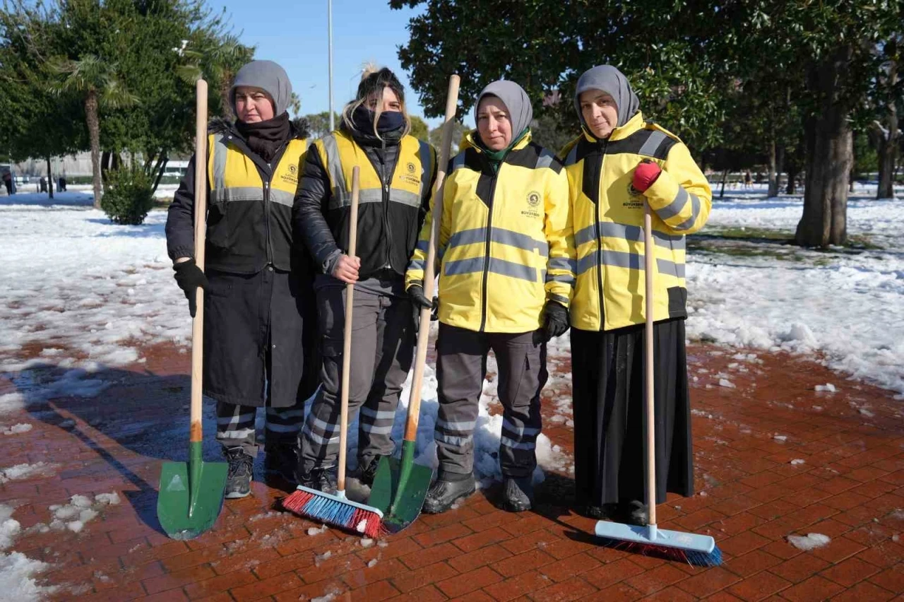 Temizlik görevlisi Hülya Şahiner, "Mevsim şartlarına göre güneşli havada süpürge, yağmurlu ve karlı havada kürekle çalışıyoruz. Alıştık, artık zor olmuyor. 2 tane çocuğum var. Biz de ev ekonomisine katkı sağlamak için buradayız. Belediye başkanımıza, daire başkanımıza teşekkür ediyoruz. İnşallah biz de daimiliği bekliyoruz" diye konuştu.