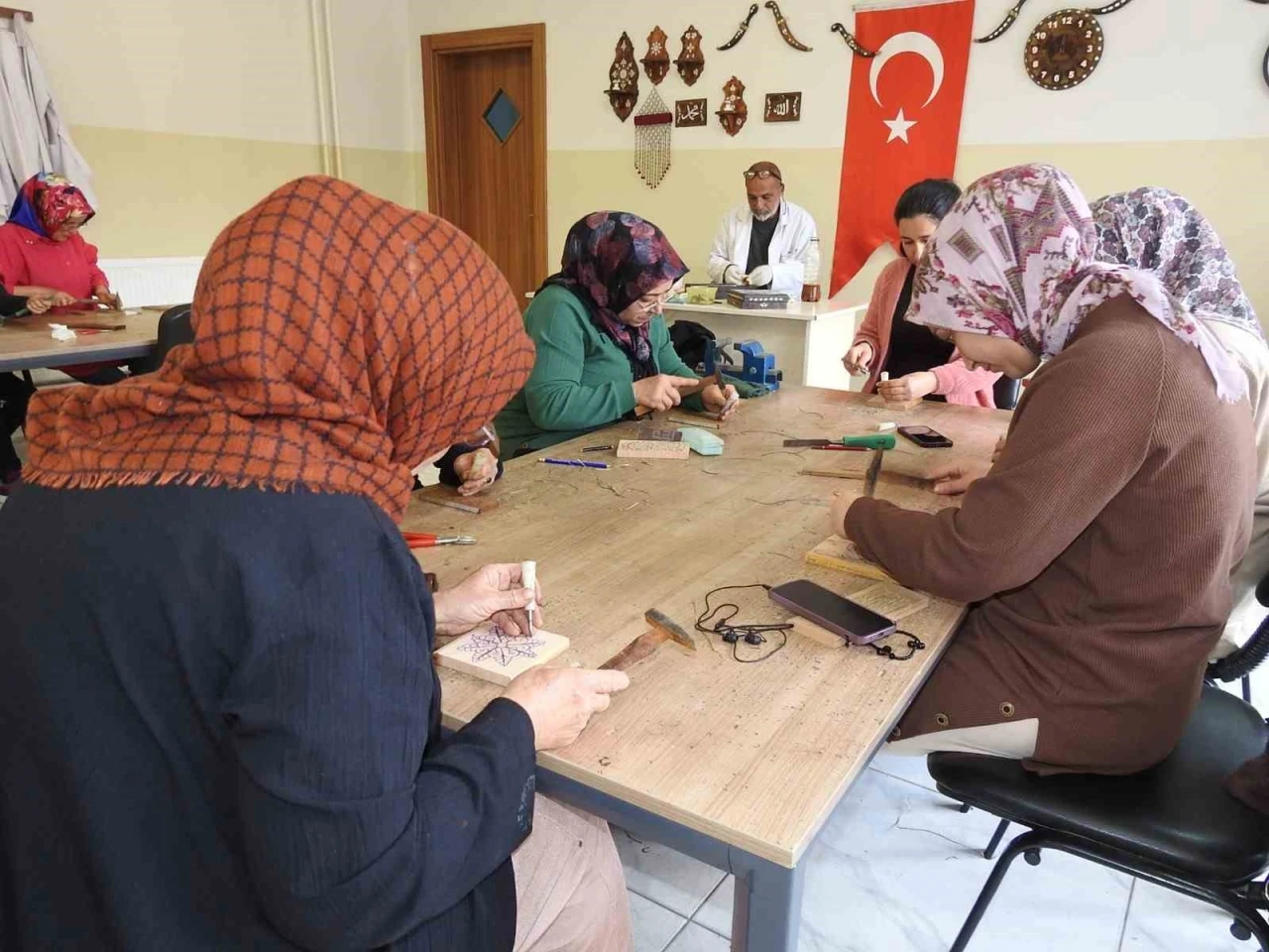 Şahinbey Belediyesi’ne bağlı Hasan Celal Güzel Gençlik Merkezi’nde sedef kakma kursuna katılan kadınlar, hünerli elleriyle birbirinden güzel ahşap işlemeler yapıyor.
