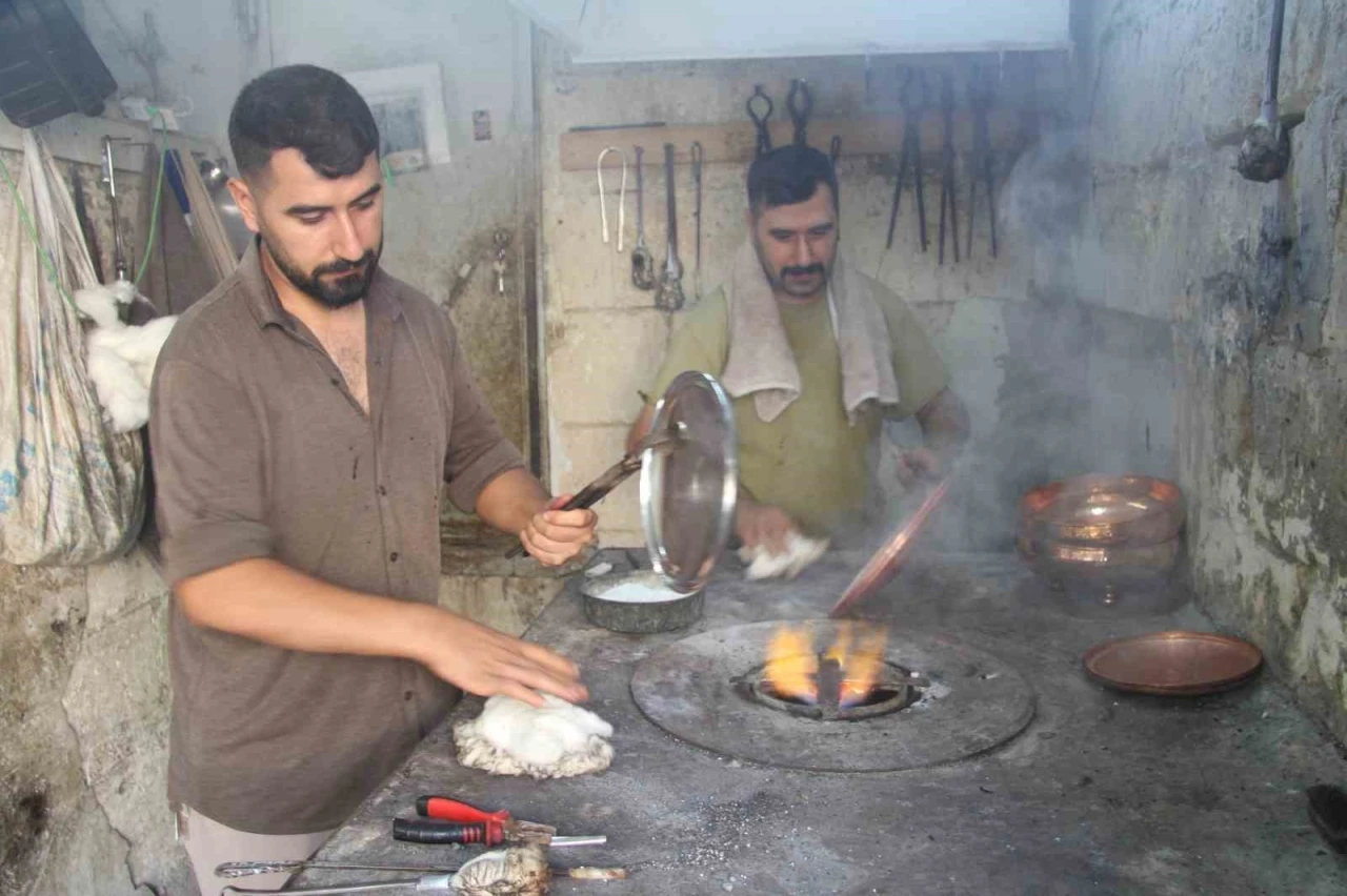 Hava sıcaklığının 40 dereceyi bulduğu Gaziantep’te baba mesleğini sürdüren kalaycılar, yaklaşık 200 derecede yanan ocağın başında zorlu mesailerini sürdürüyor.