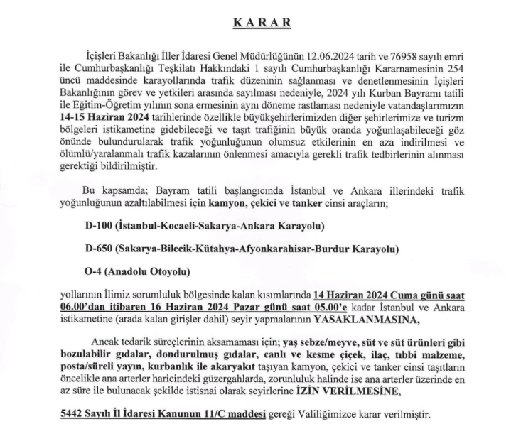 Sakarya Valiliği, bayram ve okullardaki tatil sebebiyle trafikte yaşanabilecek olumsuz durumlara engel olmak gayesiyle kamyon, tanker ve çekici cinsi araçlara 24 saatlik seyir yasağı getirdi. İlgili yasak 14 Haziran Cuma günü saat 06.00’dan itibaren, 16 Haziran Pazar günü saat 5.00’e kadar uygulanacak. Hususa ilişkin valilikten yapılan açıklamada ise, “2024 yılı Kurban Bayramı tatili ile eğitim-öğretim yılının sona ermesinin aynı döneme rastlaması sebebiyle vatandaşlarımızın 14-15 Haziran tarihlerinde özellikle büyükşehirlerimizden diğer şehirlerimize ve turizm bölgeleri istikametine gidebileceği ve taşıt trafiğinin büyük oranda yoğunlaşabileceği göz önünde bulundurularak trafik yoğunluğunun olumsuz etkilerinin en aza indirilmesi ve muhtemel kazaların önlenmesi gayesiyle trafik tedbirlerinin alınması bildirilmiştir. Bu çerçevede bayram tatili başlangıcında İstanbul ve Ankara illerindeki trafik yoğunluğunun azaltılabilmesi için kamyon, çekici ve tanker cinsi araçların D-100, D-650 ve Anadolu Otoyollarının ilimiz sorumluluk bölgesine kalan bölümlerinde 14 Haziran Cuma günü saat 06.00’dan itibaren, 16 Haziran Pazar günü saat 5.00’e kadar İstanbul ve Ankara istikametinde (arada kalan gişeler dahil) seyir yapmalarının yasaklanmasına, tedarik süreçlerinin aksamaması için; yaş sebze ve meyve, süt, süt ürünleri gibi bozulabilir gıdalar, dondurulmuş gıdalar, canlı ve kesme çiçek, ilaç, tıbbi malzeme, posta, süreli yayın, kurbanlık ile akaryakıt taşıyan kamyon, çekici ve tanker cinsi taşıtların öncelikle ana arterler haricindeki güzergahlarda, zorunluluk halinde ise ana arterler üzerinde en az süre ile bulunacak şekilde istisnai olarak seyirlerine izi verilmesine valiliğimizce karar verilmiştir” denildi.