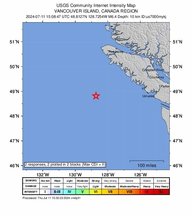 ABD Jeolojik Araştırmalar Kurumu (USGS), Kanada’nın Tofino kentin açıklarında 6.4 büyüklüğünde deprem meydana geldiğini bildirdi.