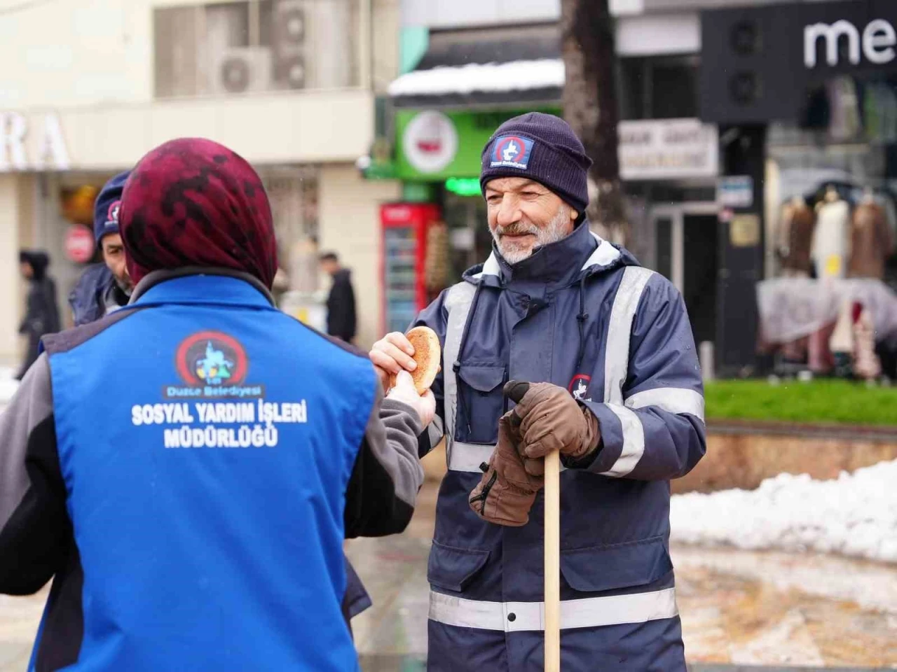 Düzce Belediyesi Sosyal Yardım İşleri Müdürlüğü de sahadaki karla mücadele ekiplerini unutmadı. Ekiplerin görev noktalarına yapılan ziyaret sırasında, karla mücadeleye devam eden personele sıcak çay ve poğaça ikram edildi. Bu iç ısıtan jest, zorlu çalışma şartlarında görev yapan çalışanlara moral kaynağı oldu.