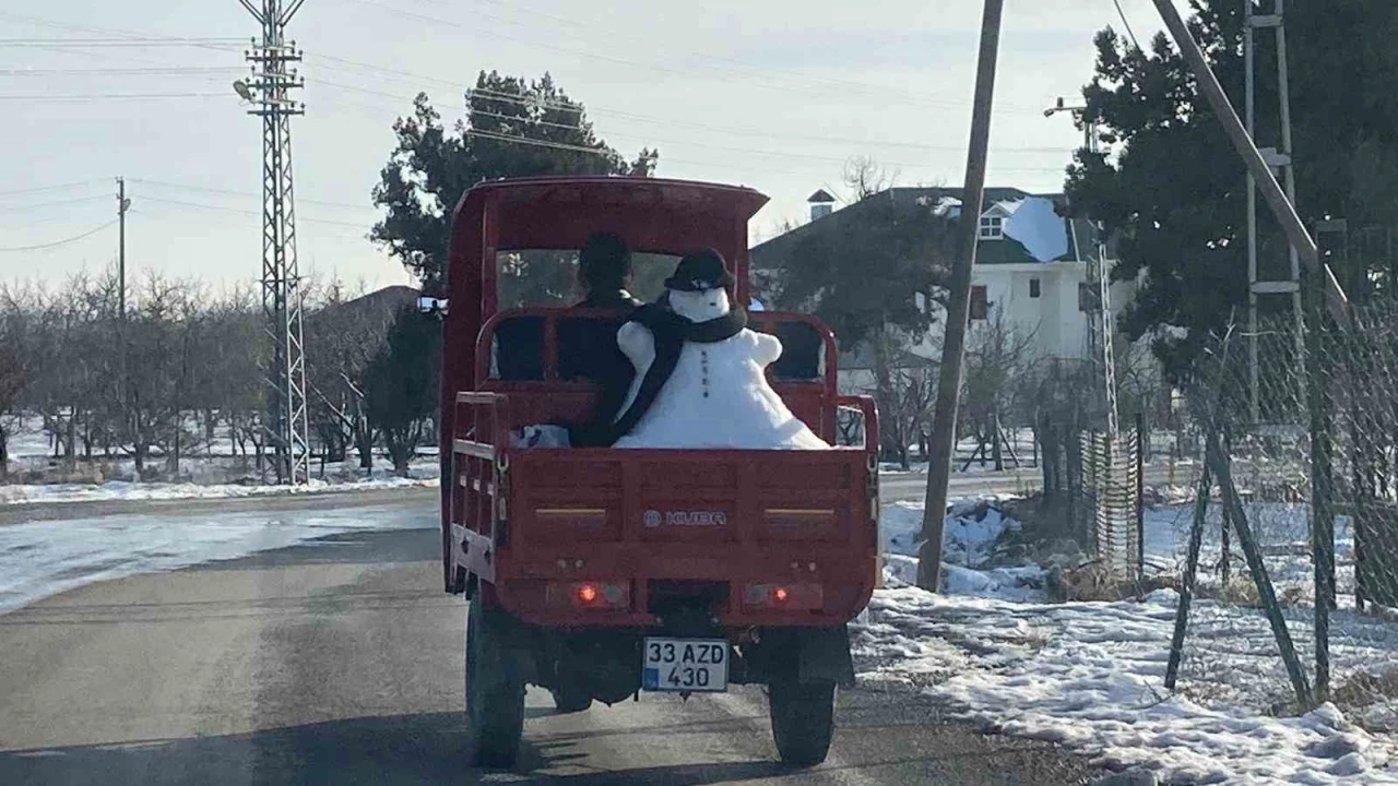 Mersin’in il ve ilçe merkezlerinde kar yağışı etkili olmaması nedeniyle bir çok kişi yüksek rakımlı bölgelere çıktı. Kar görmek için Erdemli ilçesine bağlı bir çok mahalleden oluşan Avgadı yaylasına 3 tekerlekli motosikleti ile çıkan bir kişi ise kasaya kardan adam yaptı. Yaptığı kardan adama bere ve atkı da takan sürücü, ilçe merkezine doğru yola çıktı. Motosikletle götürülen kardan adam bir çok kişinin de dikkatini çekti. Gülümseten görüntüler oluşturan o anlar kameraya da yansıdı.