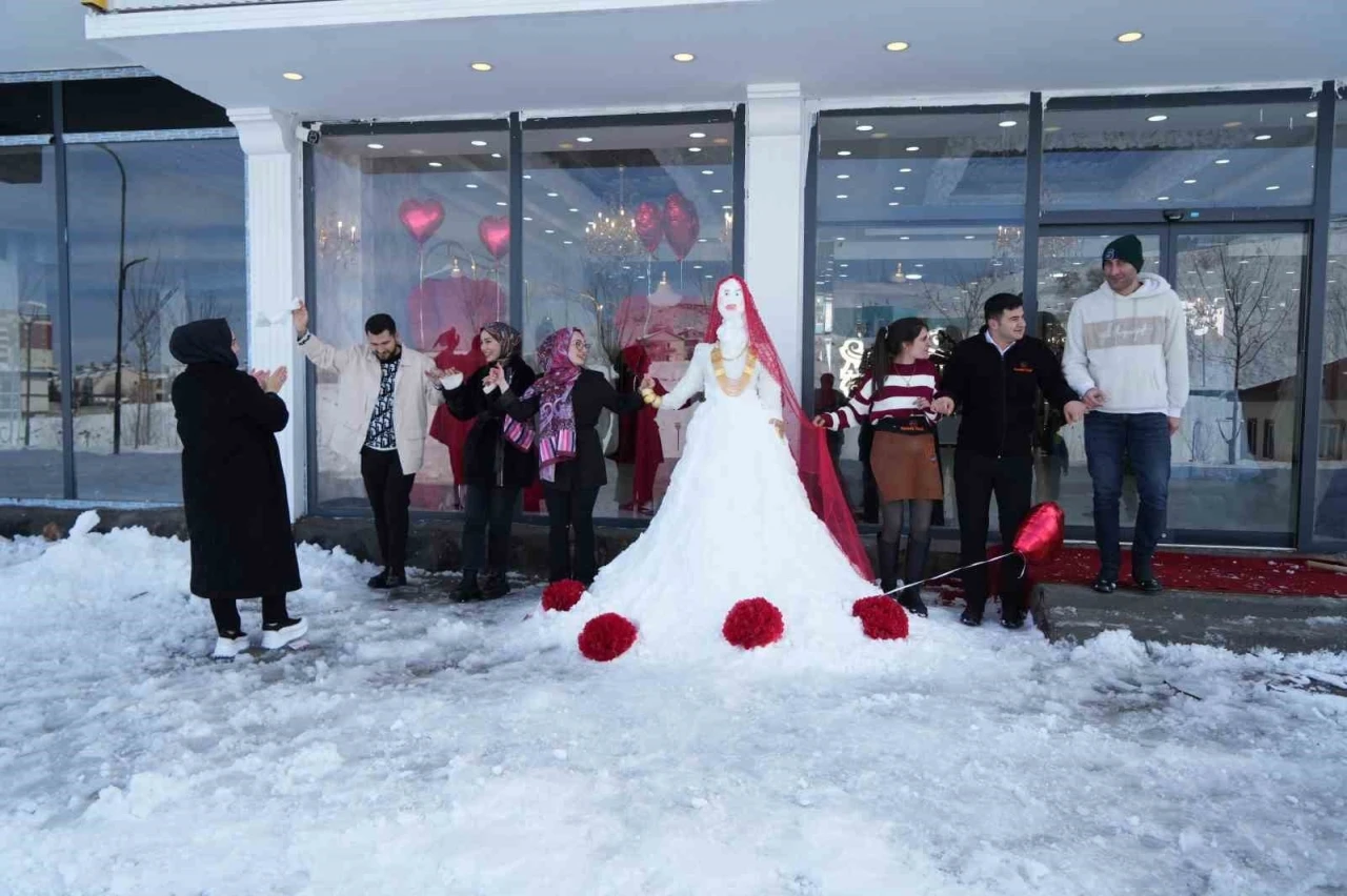 Altın bilezik, kolye ve küpelerle süslenen kardan gelin, görenlerin ilgisini çekerken, Mukadder Er ve ekibi kardan gelinle birlikte halay çekerek karın tadını çıkardı. Bu farklı etkinlik, kısa sürede sosyal medyada da gündem oldu.