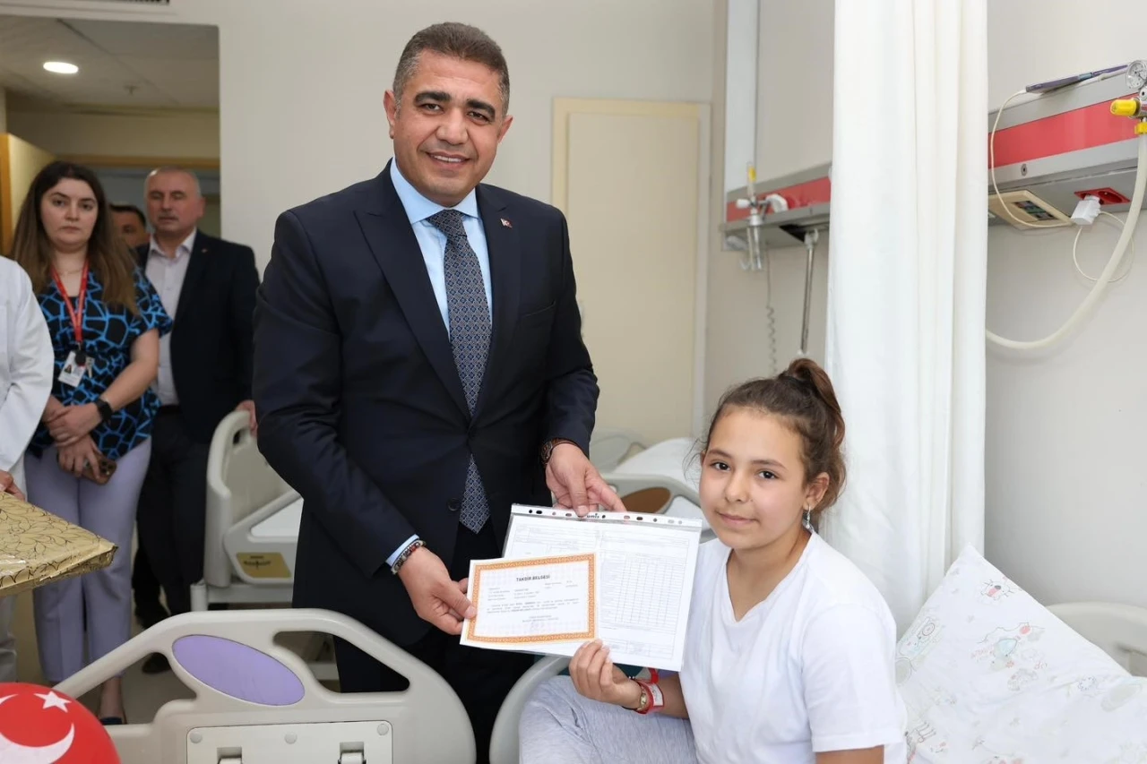 Vali Aslan, karne döneminde sağlık sorunları nedeniyle hastanede geçirmek zorunda kalan öğrencileri odalarında ziyaret ederek karnelerini takdim etti. Karnelerini Vali Aslan’ın elinden alan öğrencilerin mutluluğu gözlerinden okunurken, aileleri de duygusal anlar yaşadı.