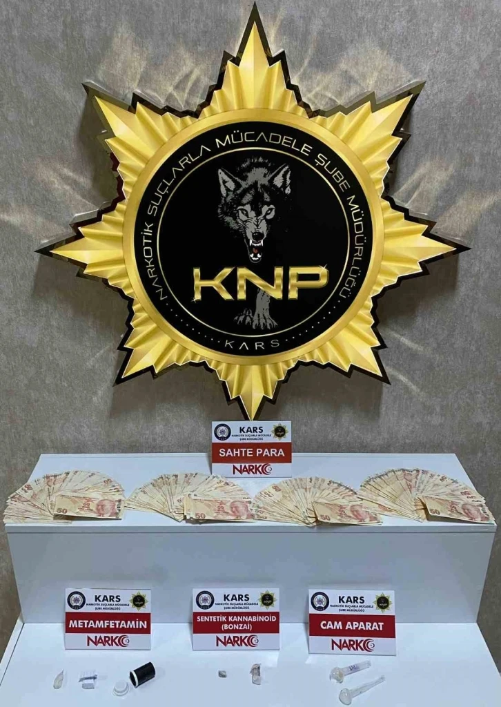 KOM ve Narkotik ekiplerince düzenlenen ’apart’ operasyonunda yapılan aramada; 5 farklı seri numarasına sahip 776 adet 50 TL’lik olmak üzere toplam 38 bin 800 TL sahte para, 2 parça halinde toplam 2,90 gram metamfetamin, 2 parça halinde toplam 0,97 gram bonzai, içerisinde metamfetamin bulaşığı bulunan şişe ve 2 cam aparat ele geçirilerek muhafaza altına alındı.