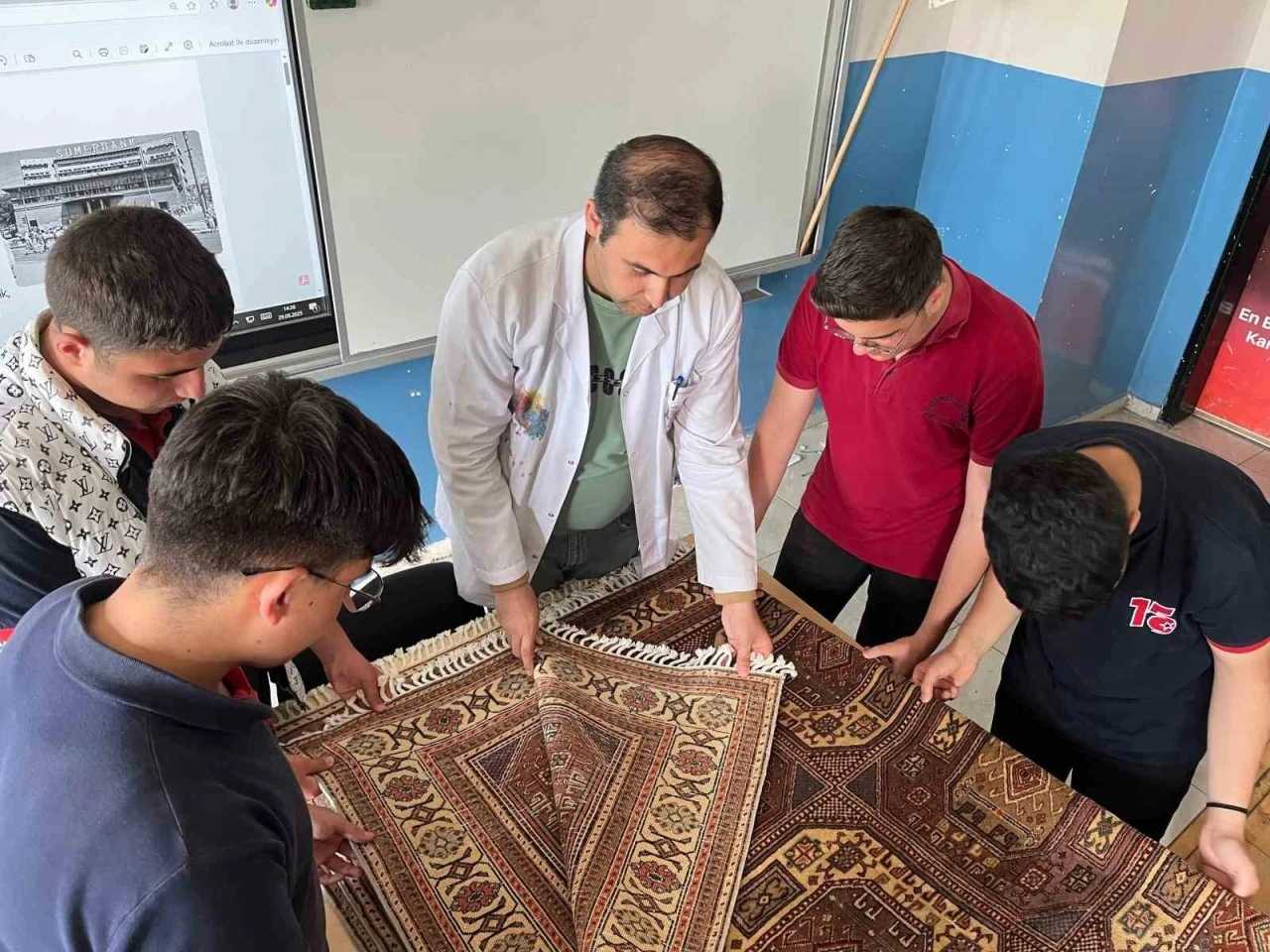 Okulda oluşturulan özel etkinlikte, yıllardır sandıklarda saklı kalan orijinal Sümerbank halıları ilk kez bu kadar yakından tanıtıldı. Okulun öğretmeni Halı Kilim ve Eski Kumaş Desenleri Uzmanı Mehmet Doğan, rehberliğinde yapılan sunumlarla, öğrenciler sadece bir halı değil; geçmişin estetiğini, emeğini ve kimliğini keşfetti.