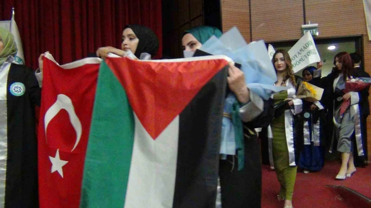 Törenin düzenlendiği salona öğrenciler, ellerinde farklı pankartlarla gelerek, Türk, Filistin ev Doğu Türkistan bayrakları açarken, bir öğrencinin elindeki "Ali Koç" istifa pankartı ise dikkat çekti.