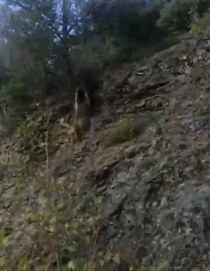 Zonguldak’ın Devrek ilçesinde bozayı ile karşılaşan köy muhtarı Mehmet Ergirdi, “Gel oğlum gel” diye ayıya seslendi. Kulaklarını havaya diken ayı ise kendisini çeken cep telefonuna adeta poz verdikten sonra, ormanlık alanda gözden kayboldu.