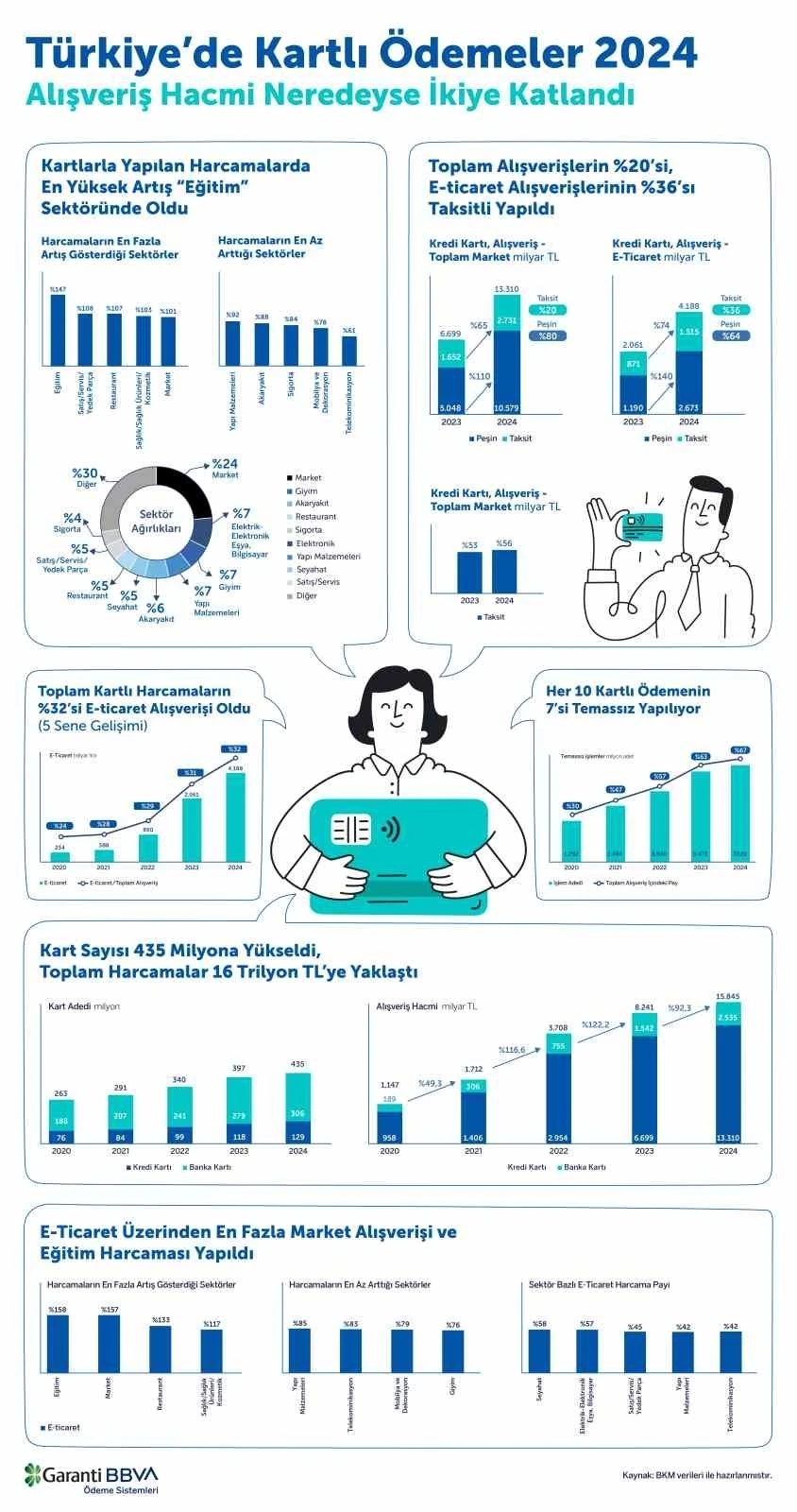 Türkiye’de 2024 yılında kredi kartı ve banka kartıyla yapılan alışveriş hacmi neredeyse ikiye katlandı. Alışverişlerde peşin ödeme tercih edilirken, temassız işlemlerin oranı da yüzde 67’ye ulaştı. Garanti BBVA Ödeme Sistemleri’nin (GÖSAŞ) BKM verilerini temel alarak gerçekleştirdiği ‘Türkiye’de Kartlı Ödemeler 2024’ çalışmasının sonuçları açıklandı. GÖSAŞ’ın verilerden yola çıkarak hazırladığı infografik, Türkiye’de geçtiğimiz yıl banka ve kredi kartı sahipliği, kartlı harcamalardaki trendler ve e-ticaret alanındaki büyüme oranları hakkında bilgi veriyor. Kart sayısı yükseldi, toplam harcamalar 16 trilyon TL’ye yaklaştı