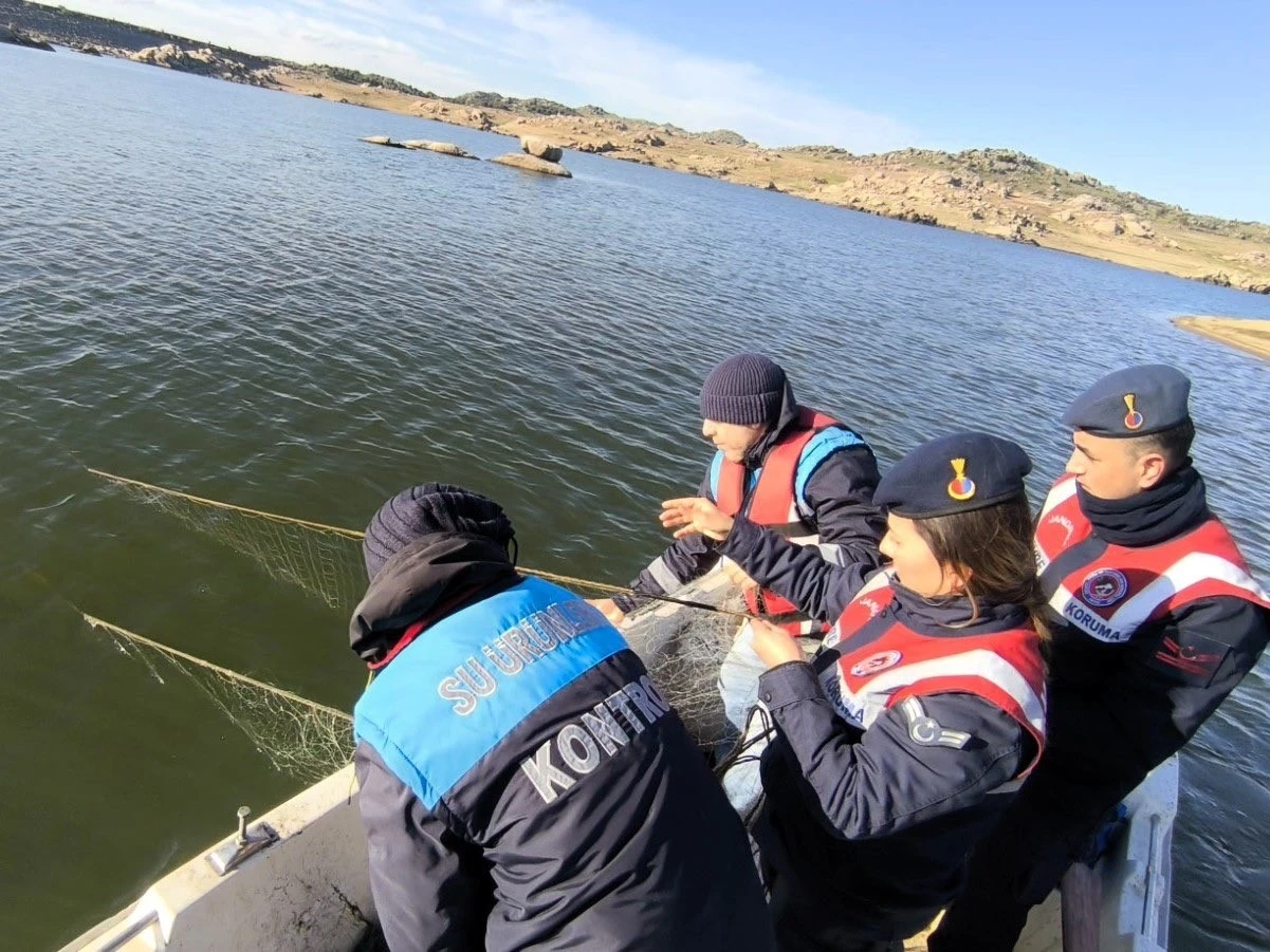 Kırklareli merkez ilçe sınırındaki Kayalı Barajı’nda, Jandarma Çevre Koruma Timi (HAYDİ) ve İl Tarım ve Orman İl Müdürlüğü teknik personelleri iş birliğinde, sazangiller av yasağı döneminde yaptıkları ortak denetimlerde, kaçak ağlara el konuldu. Ağlara takılan balıklar ise suya salındı.