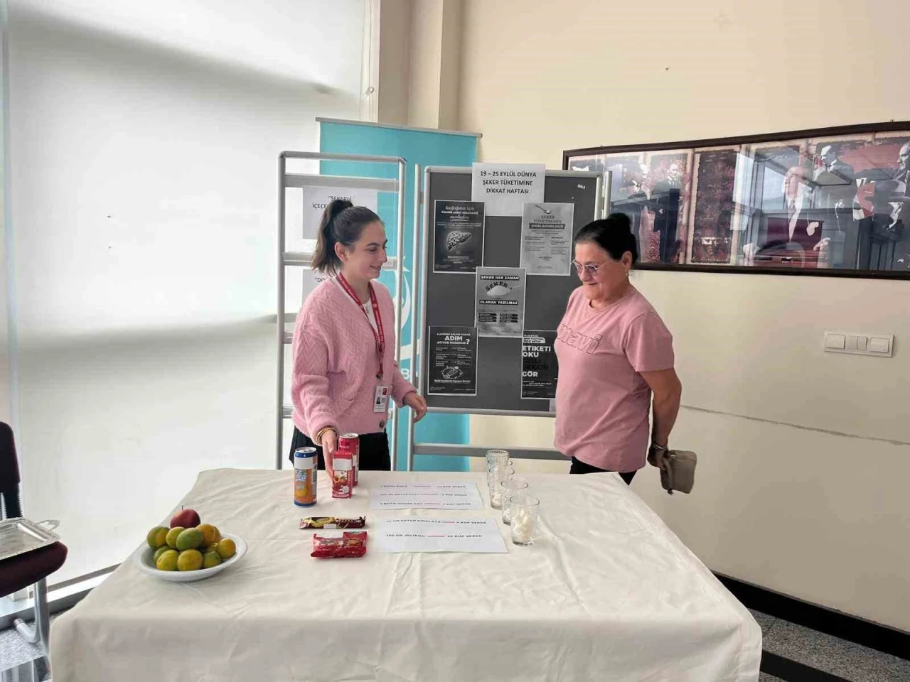 DÜZCE (İHA) – Düzce İl Sağlık Müdürlüğü bünyesinde çalışmalarına devam eden Kaynaşlı Toplum Sağlığı Merkezi ilçe hastanesinde uygulamalı açtıkları stantta vatandaşlara şeker tüketimi ile ilgili bilgilendirmelerde bulundu.