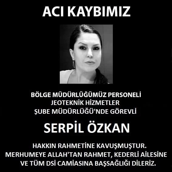 Kurumun sosyal medya hesabından yapılan paylaşımda, "Acı kaybımız. Bölge müdürlüğümüz personeli Jeoteknik Hizmetler Şube Müdürlüğü’nde görevli Serpil Özkan hakkın rahmetine kavuşmuştur. Merhumeye Allah’tan rahmet, kederli ailesine ve tüm DSİ camiasına başsağlığı dileriz" ifadelerine yer verildi.