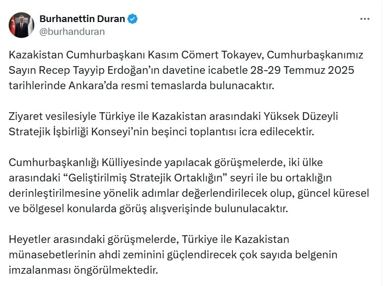 Duran, sosyal medya hesabından yaptığı paylaşımda Kazakistan Cumhurbaşkanı Kasım Cömert Tokayev’in Türkiye’ye geleceğini duyurdu. Duran paylaşımında, "Kazakistan Cumhurbaşkanı Kasım Cömert Tokayev, Cumhurbaşkanımız Sayın Recep Tayyip Erdoğan’ın davetine icabetle 28-29 Temmuz 2025 tarihlerinde Ankara’da resmi temaslarda bulunacaktır. Ziyaret vesilesiyle Türkiye ile Kazakistan arasındaki Yüksek Düzeyli Stratejik İşbirliği Konseyi’nin beşinci toplantısı icra edilecektir" dedi.