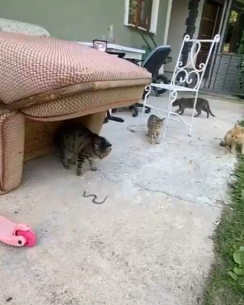 Gümüşhane’de bahçede karşılarına çıkan yavru yılanla oynayan kedilerin görüntüleri cep telefonu kamerasıyla kaydedildi.