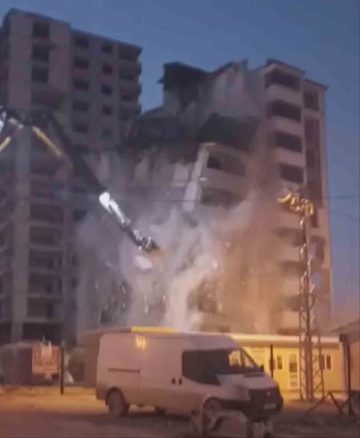 Kahramanmaraş merkezli depremlerde ağır hasar alan Hatay’da asrın felaketinin yaralarını sarmak için çalışmalar aralıksız sürüyor. Enkaz kentte bir yandan afet konutlarının yapımı devam ederken, diğer yandan da ağır hasarlı binaların yıkımı devam ediyor. Antakya ilçesinde 10 katlı bina iş makinesiyle yıkılmak istendi. Yıkım esnasında iş makinasının müdahalesiyle binanın yarısı yerle bir olurken, diğer yarısı ayakta kaldı. Yıkım anıa cep telefonu kamerasına yansıdı. Bölgede bulunan çok katlı binaların kısım kısım yıkılması ise konteyner çarşısındaki esnafı olumsuz etkiliyor.