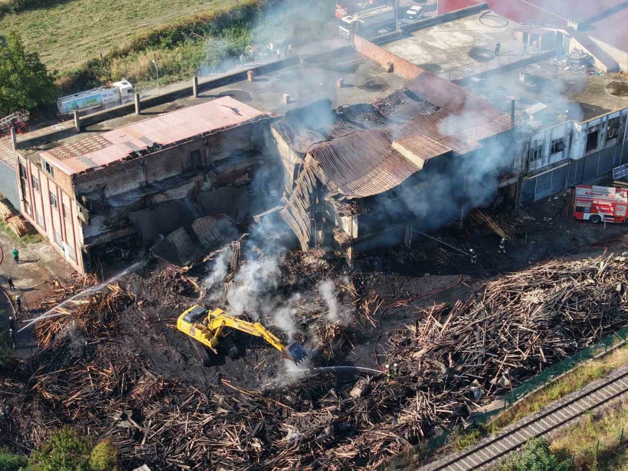 Samsun’un Tekkeköy ilçesinde dün gece çıkan kereste fabrikası yangınının ardından ekiplerin soğutma çalışmaları devam ediyor. Küle dönen fabrika gündüz saatlerinde dronla görüntülendi.