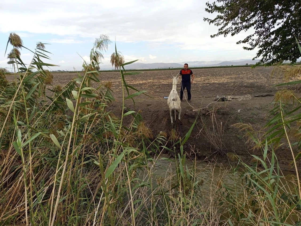 Kırıkhan ilçesi Karadurmuşlu Mahallesi’nde sulama kanalına düşen eşeği fark eden vatandaşlar, hayvanı kendi imkanlarıyla kurtaramayınca durumu itfaiye ekiplerine bildirdi. İhbar üzerine bölgeye gelen Hatay Büyükşehir Belediyesi itfaiye ekipleri, eşeği titiz çalışmayla sağlıklı şekilde kurtardı. Kurtarılan eşek, sahibine teslim edildi.