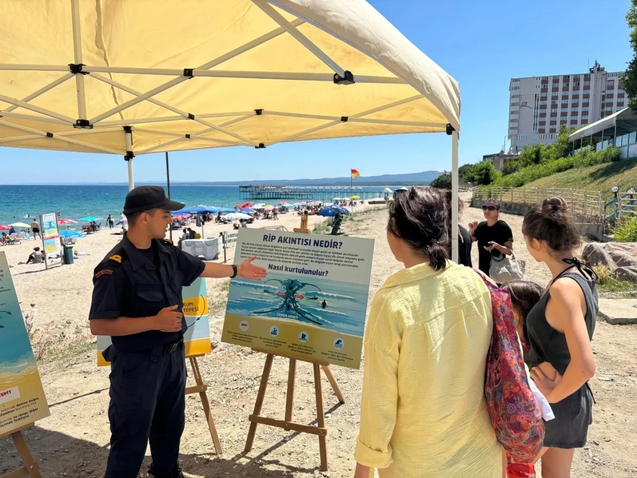 Kırklareli’nin Demirköy ilçesine bağlı İğneada beldesinde Sahil Güvenlik Karakol Komutanlığı ekipleri, halk plajına stant kurdu. Ekipler yerli ve yabancı turistleri boğuma vakalarına karşı rip akıntısı konusunda bilgilendirerek broşür dağıttı.