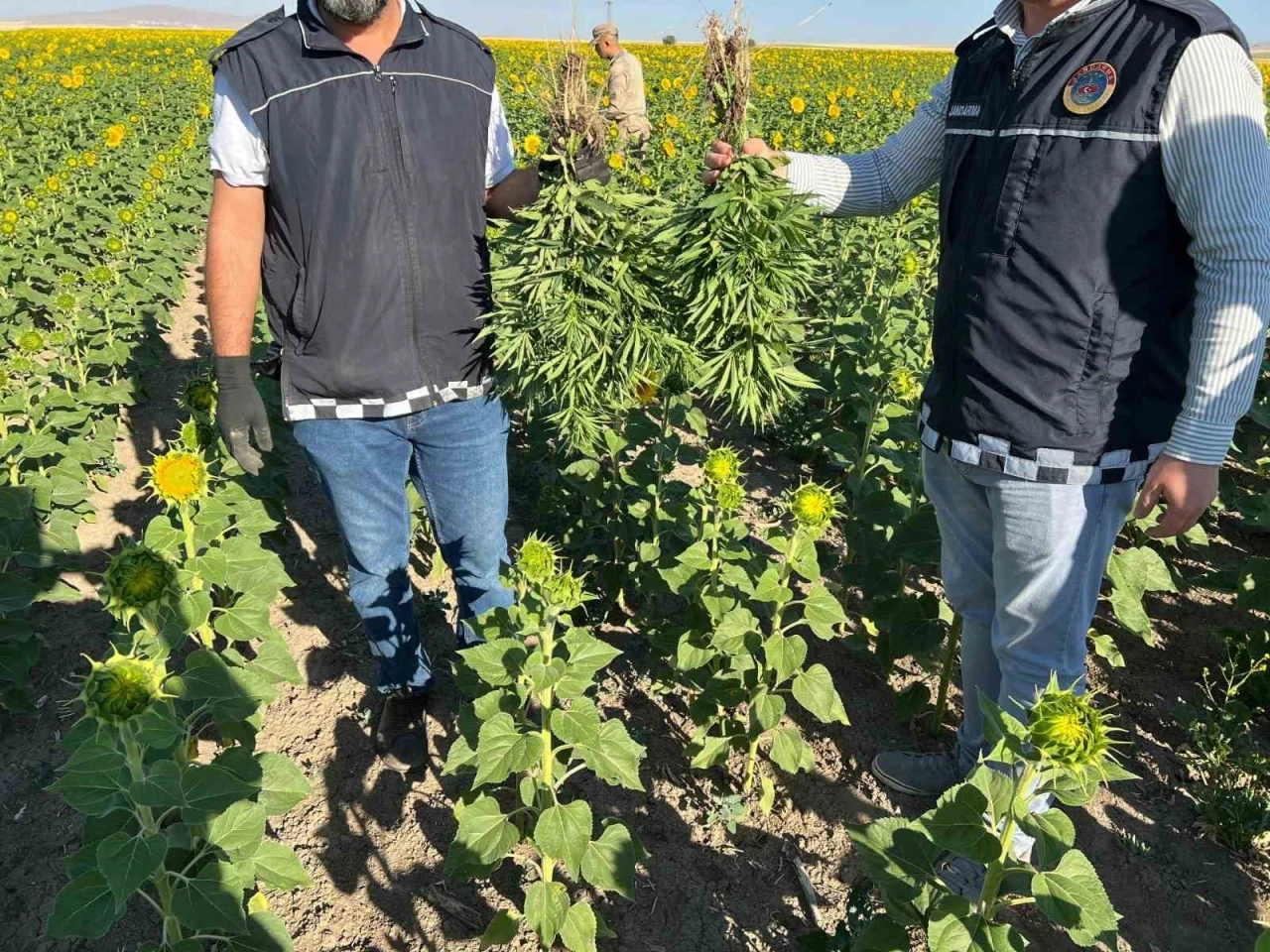 KIRŞEHİR (İHA) – Kırşehir’de bir ayçiçeği tarlasında yasa dışı kenevir yetiştirildiği ihbarı üzerine jandarma ekiplerince düzenlenen operasyonda kenevir bitkisi ele geçirilirken 2 tarla işçisi gözaltına alındı.