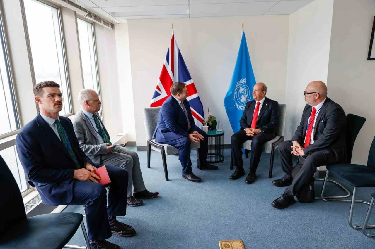 KKTC Cumhurbaşkanı Ersin Tatar, Kıbrıs konulu genişletilmiş formatlı 5+1 gayriresmi toplantısına katılmak üzere bulunduğu ABD’nin New York kentinde temaslarına devam ediyor. Cumhurbaşkanı Tatar, İngiltere’nin Avrupa ve Kuzey Amerika’dan Sorumlu Devlet Bakanı Stephen Doughty ile bir araya geldi. Cumhurbaşkanı Tatar’a görüşme sırasında özel temsilcisi Güneş Onar da eşlik etti.