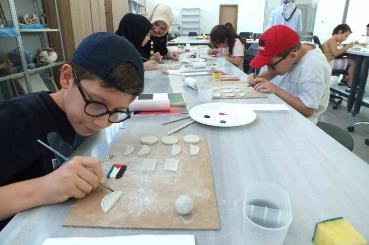 Kocaeli’de çocuklar katıldıkları seramik atölyesinde Filistin bayrağından rozetler yaparak zulme karşı kardeşlerinin yanında olduklarını söyledi.