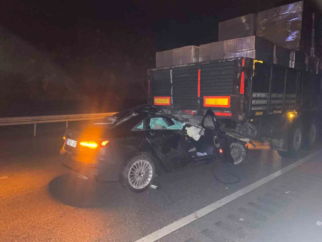 Burdur-Antalya karayolunda seyir halindeyken yağış nedeniyle kayganlaşan yolda duramayan lüks otomobilin önünde seyreden tıra arkadan çarpması sonucu 1’i ağır 2 kişi yaralandı. Kaza saat 22.00 sıralarında Burdur’un Çeltikçi ilçesi Burdur Antalya karayolu Tekke köyü rampasında meydana geldi. Edinilen bilgilere göre Burdur’dan Antalya istikametine seyir halinde olan Bayram Y. (36) idaresindeki 07 BOY 467 plakalı Audi marka lüks otomobil Tekke rampasına geldiği esnada yağış nedeniyle kayganlaşan yolda duramayarak önünde seyreden İbrahim Y. (23) idaresindeki 03 ACM 293 plakalı tırın dorsesine çarptı. Kazanın şiddetiyle dorsenin altına giren lüks otomobil sürücüsü Bayram Y. ve araçta yolcu olarak bulunan Timurtaş A. (31) araç içerisinde sıkışarak yaralandı. Çevredekilerin 112 Acil Çağrı Merkezine ihbarı üzerine olay yerine sağlık, itfaiye, polis ve jandarma ekipleri sevk edildi. Olay yerine gelen itfaiye ekiplerinin çalışmaları sonucunda araç içerisinden çıkarılan yaralılar sağlık ekiplerinin ilk müdahalesinin ardından ambulans ile Burdur Devlet Hastanesi’ne kaldırıldı. Hastaneye kaldırılan yaralılardan Timurtaş A.’nın hayati tehlikesinin olduğu öğrenilirken kazaya karışan araçlar çekici yardımıyla yoldan kaldırıldı.