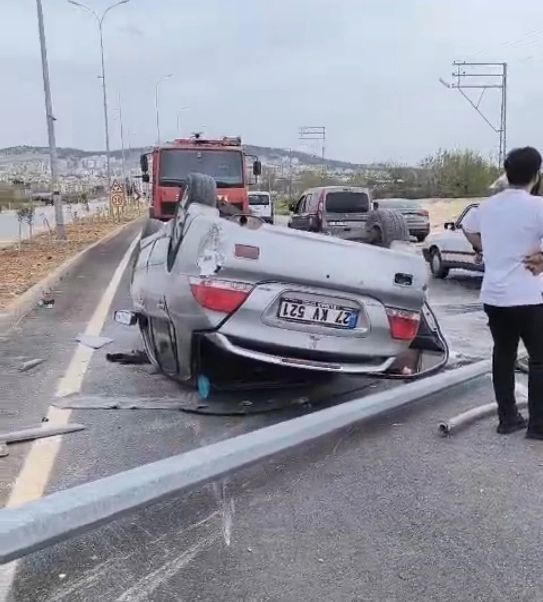 Olay, akşam saatlerinde Oğuzeli havalimanı yolu üzerinde meydana geldi. İddiaya göre, sürücüsü öğrenilemeyen 27 KV 521 plakalı otomobil, direksiyon hakimiyeti kaybolduktan sonra savruldu. Savrulan otomobil orta refüjdeki aydınlatma direğine çarptıktan sonra ters döndü. Feci kaza sonrası çevredeki vatandaşların ihbarı üzerine olay yerine çok sayıda polis, sağlık ve itfaiye ekibi sevk edildi. Kazada yaralanan 2 kişi, sağlık ekiplerince yapılan ilk müdahalenin ardından ambulanslarla hastaneye kaldırdı.