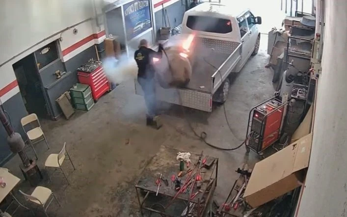 Patlama anı saniye saniye iş yerinin güvenlik kamerasına yansıdı. Görüntülülerde; ustanın kaynak yapması, bir anda alev alıp patlama anı ve sonrasında yaşanan panik yer alıyor.