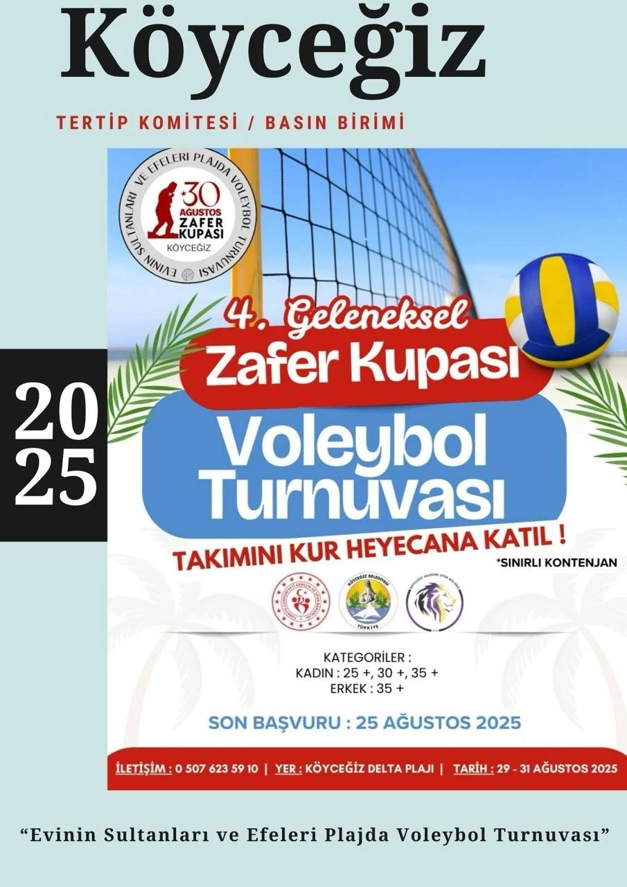 Köyceğiz Belediye Başkanlığı, İlçe Gençlik ve Spor Müdürlüğü ve Köyceğiz Spor Kulübü iş birliğinde, "Evinin Sultanları" projesi kapsamında düzenlenen 4. Geleneksel Zafer Kupası, 29-31 Ağustos tarihleri arasında Köyceğiz Delta Plajında yapılacak. Üç senedir gerçekleştirilen 30 Ağustos Zafer Kupası’nın bu seneki konsepti "kadına şiddet ve kadın cinayetleri karşıtlığı" olacak. 4. Geleneksel Zafer Kupası Voleybol Turnuvası’nda takımlar; Kadın: 25+, 30+, 35+ Erkek: 35+ kategorilerinde olacak. Evinin Sultanları ve Efeleri Plajda Voleybol Turnuvası’na katılmak isteyen takımlar 25 Ağustos 2025 tarihine kadar başvuru yapabilecek.