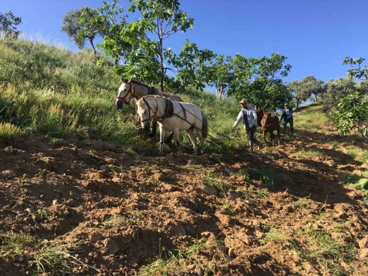 Türkiye genelinde olduğu gibi Aydın’da da gençler köylerini ve mahallelerini terk edip üretim yaşlı nüfusa kaldı. Gençler kenti tercih ederken tarım arazileri ise büyükler tarafından işleniyor. Germencik ilçesinin Dampınar Mahallesi’nin nüfusu yaklaşık 400 kişi. Bu mahallenin az sayıdaki genci, köyünü terk etmeyerek üretimi sürdürdüğü gibi ileri yaştaki çiftçinin de tarlasını ve bahçelerini atla sürerek hem kendilerine ekonomik anlamda destek sağladıkları gibi hem de mahallesindeki vatandaşlara yardımcı oluyor. 18 yaşındaki Kerem Çamkaya ile 22 yaşındaki İbrahim Aydın, küçük yaştan itibaren eğittikleri atları ile dağlık arazide çift sürüyor. Ayrıca kendilerine ait zeytin ve incir bahçelerini işleyip üretime katkı sunuyorlar. Köylerinin geçim kaynağının incir ve zeytin olduğunu belirten Kerem Çamkaya, iki atıyla birlikte her gün farklı bir noktada çift sürdüklerini söyledi. At ile çift sürmenin oldukça zor olduğunu dile getiren Çamkaya; “Köyümü terk etmedim çiftçilik yapıyorum. Köyümüzde çok az sayıda genç kaldı, onlardan biri de benim. İşimiz olduğu için köyde kaldık şehre gitmedik. At ile çift sürüyoruz. Yevmiye hesabı çalışıyoruz. Günlük 3 bin liraya çalışıyoruz. Alnımızın terinin hakkını alıyoruz. Günümüzde gençler böyle işlerle uğraşmak istemiyor. Bence köylerine sahip çıksınlar” dedi. Dedesinden babasına kalan atla çift sürme mesleğini sürdüren İbrahim Aydın ise “Çiftçilik yapıyoruz. Geçim kaynağımız incir ve zeytin. Biz bu incir ve zeytinlerin bakımını yapıp çiftini sürüyoruz. Atların bakımını yapıyoruz. Çiftçilik bizim dede mesleğimiz. Dedem yıllarca at ile çift sürmüş. Sonra babam bu işi devam ettirdi ve şimdi at ile çift sürme işi bize kaldı. Bu işi severek yapıyoruz. Severek yapmazsak zaten bu işi yapamazsın” diye konuştu. Çift sürerken vermiş olduğu komutları anında anlayıp yerine getiren atların nasıl bir süreçten geçtiğini de anlatan Aydın; “Çift sürdüğümüz atları eğitimden geçiriyoruz. Bir buçuk iki yaşından sonra eğitimler başlıyor. Çift sürme eğitimini verdikten sonra incir bahçelerini sürerken verdiğimiz komutları yapıyorlar. Ağaçlara zarar vermeden aynı şeritten giderek çift sürebiliyoruz. Bu atlara gözümüz gibi bakıyoruz. Onları belirli aralıklarla dinlendirerek işlerimizi yapıyoruz. Kendimizi ve hayvanlarımızı zorlamadan sezonu tamamlıyoruz” dedi. Aydın, “Şimdiki gençler hep elinde telefonla uğraşıp zamanlarını boşa harcıyorlar. Bence çiftçilik yapsınlar ata topraklarına sahip çıkıp işlesinler. Arazilerini ekip biçseler daha iyi olur” diyerek tavsiyede bulundu.