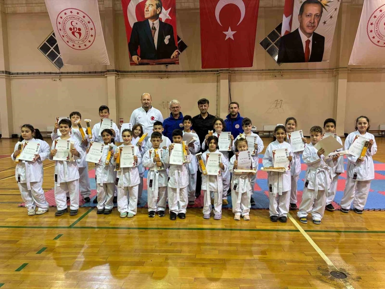 Dört aylık yoğun antrenman sürecinin ardından kuşak sınavına katılan 60 küçük karateci, hünerlerini sergileyerek izleyenlerin takdirini topladı.