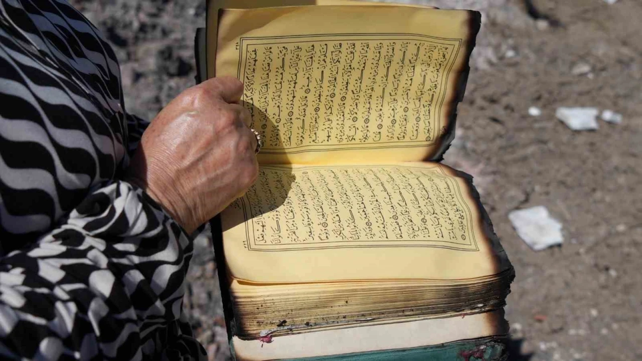 "Evimiz yandı, hiçbir şeyimiz kalmadı. Geriye sadece Kur’an-ı Kerim kaldı. Görünce çok duygulandım. Her şey kül olmuştu. Eşim, ‘Kur’an yanmamış’ dedi. Açıp baktım, yazıları olduğu gibi duruyordu. Babam, Kur’an’a geçtiğimde bana hediye etmişti. Yıllardır saklıyordum, Rabbim de saklamış. Bu bana Rabbimden bir hediye gibi oldu." "Her şeyimizi kaybettik ama Kur’an-ı Kerim kaldı"