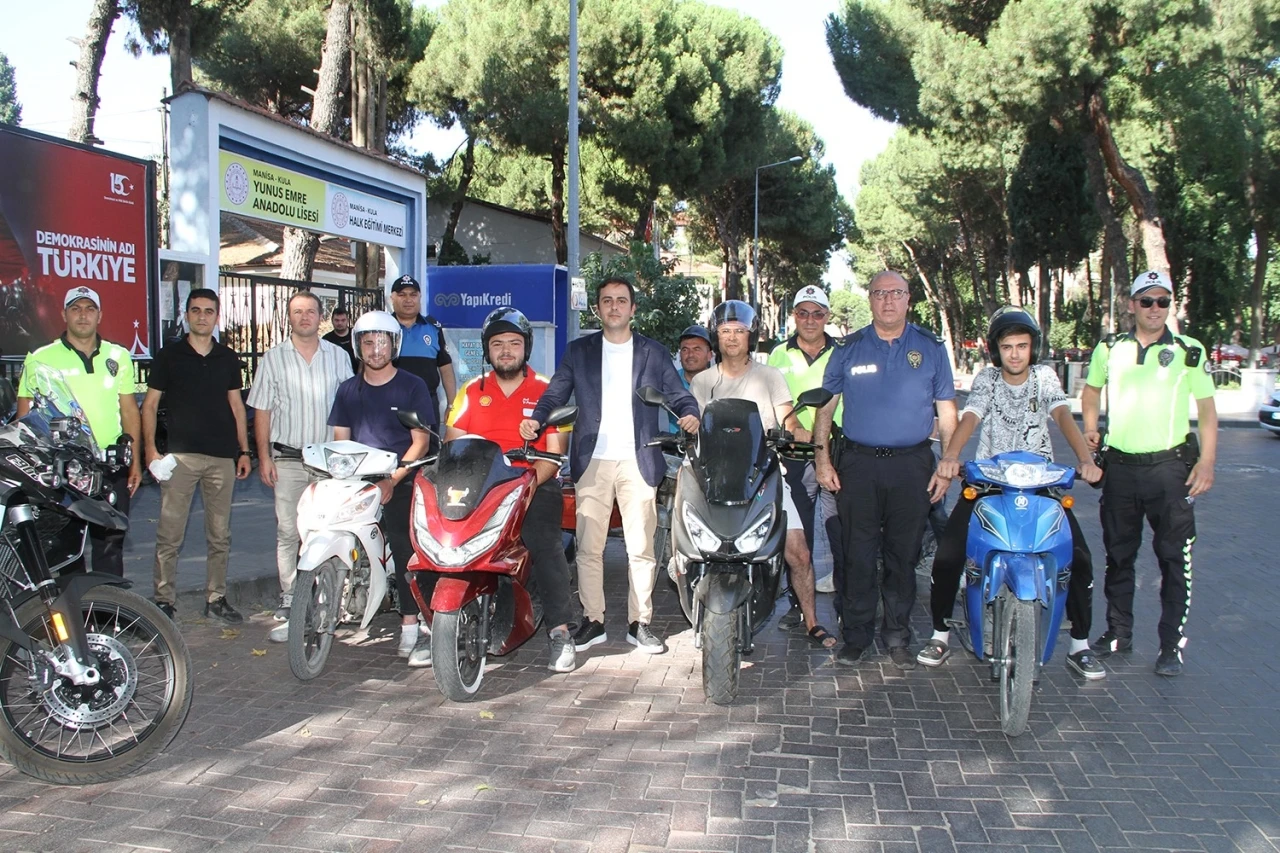Manisa’nın Kula ilçesinde artan motosiklet kazalarına karşı farkındalık oluşturmak amacıyla İlçe Emniyet Müdürlüğü koordinesinde motosiklet sürücülerine ücretsiz kask dağıtıldı.