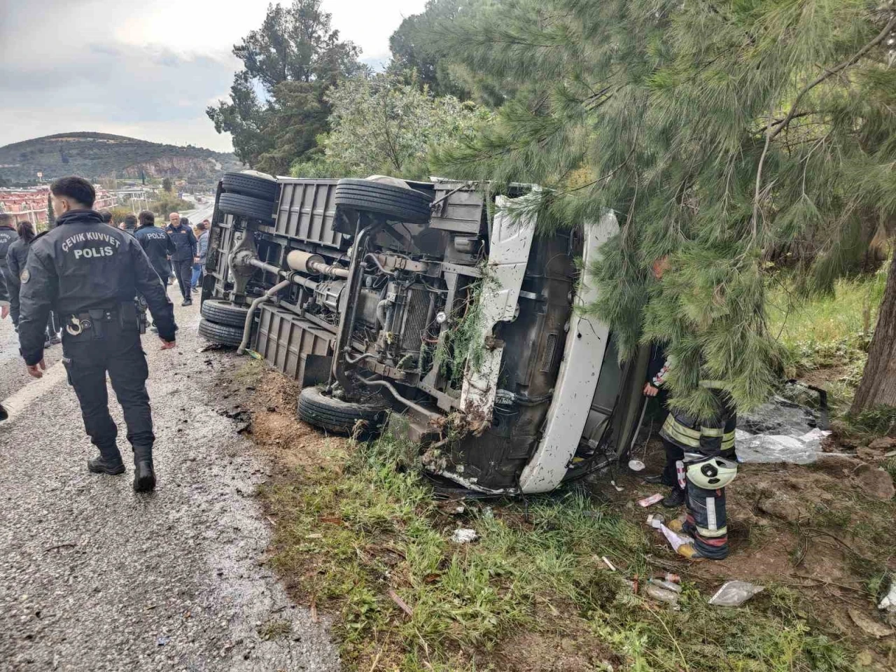 Kaza, Kuşadası-Selçuk karayolu Kuştur mevkiinde meydana geldi. Edinilen bilgiye göre, içerisinde otel çalışanlarını taşıyan Kamil D. idaresindeki 09 APP 893 plakalı servis minibüsü, yağış nedeniyle kayganlaşan yolda sürücüsünün direksiyon hakimiyetini kaybetmesi üzerine virajda yoldan çıkarak devrildi. Kaza ihbarı üzerine olay yerine çok sayıda ambulans, polis ve itfaiye ekipleri sevk edildi. Kazada yaralanan şoför dahil 12 kişi ambulanslarla Kuşadası Devlet Hastanesi’ne kaldırıldı. Yaralıların sağlık durumlarının iyi olduğu öğrenildi.