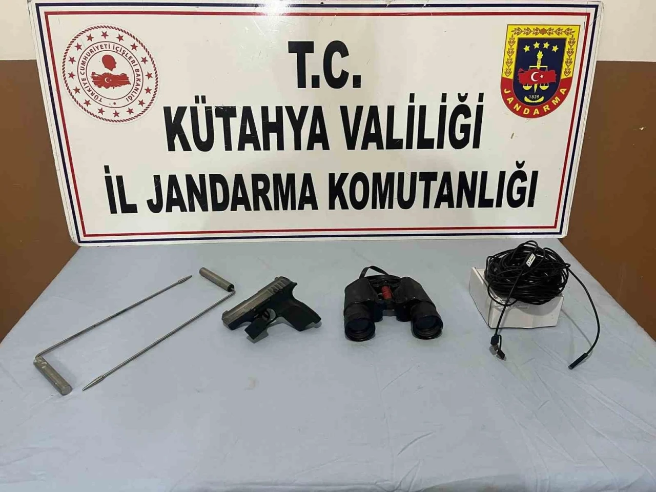 Jandarma Komutanlığı’nın il genelinde kaçakçılık suçlarıyla mücadele çerçevesinde yapılan çalışmalar neticesinde Gediz İlçe Jandarma Komutanlığı sorumluluk bölgesinde izinsiz kazı yapan şahıslara yönelik yapılan operasyonda, 1 adet yılan kamera, 1 adet dürbün, 2 adet alan tarama çubuğu ve 1 adet ruhsatsız tabanca ele geçirildi.