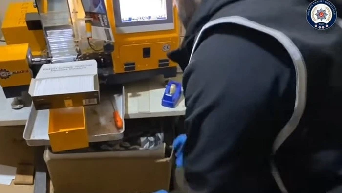 Yapılan aramalarda; 17 bin 800 adet bandrollü ve bandrolsüz boş makaron, 5.3 kilogram açık kıyılmış tütün, 1 adet elektrikli otomatik makaron doldurma makinesi ve 1 adet hava kompresörü ele geçirildi.